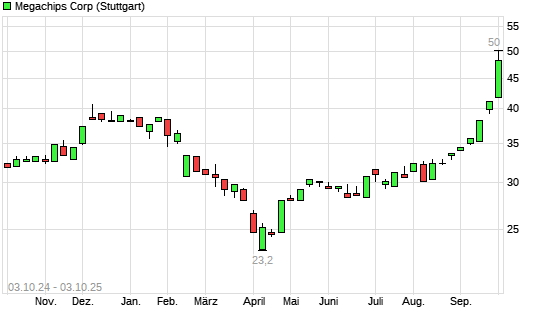 Mit dem Anstieg auf 51,00 EUR hat die Megachips-Aktie (ISIN JP3920860008) am 02.10.2025 ein neues 10-Jahres-Hoch erreicht und damit den Kurs vom 01.10.2025 eingestellt.