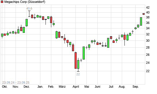 Mit dem Anstieg auf 39,80 EUR hat die Megachips-Aktie (ISIN JP3920860008) am 22.09.2025 ein neues 6-Monats-Hoch erreicht und damit den Kurs vom 19.09.2025 eingestellt.
