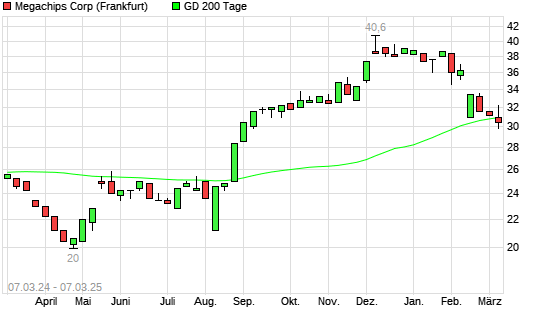 Mit dem Anstieg auf 32,20 EUR hat die Megachips-Aktie am 06.03.2025 die 200-Tage-Linie nach oben gekreuzt.