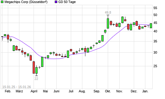 Mit dem Anstieg auf 43,80 EUR hat die Megachips-Aktie am 14.01.2026 die 50-Tage-Linie nach oben gekreuzt.
