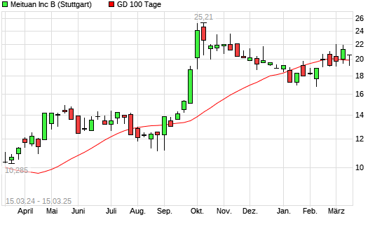 Mit dem Anstieg auf 20,63 EUR hat die Meituan-Aktie am 14.03.2025 die 100-Tage-Linie nach oben gekreuzt.