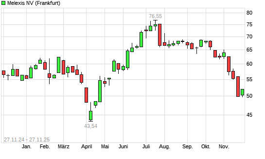 Mit dem Rücksetzer auf 49,78 EUR hat die Melexis-Aktie (ISIN BE0165385973) am 26.11.2025 ein neues 6-Monats-Tief erreicht und damit den Kurs vom 21.11.2025 eingestellt.