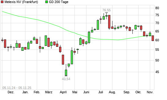 Mit dem Rücksetzer auf 59,95 EUR hat die Melexis-Aktie am 04.11.2025 die 200-Tage-Linie nach unten gekreuzt.