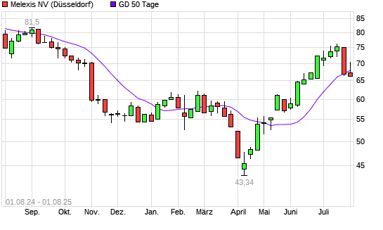 Mit dem Rücksetzer auf 67,55 EUR hat die Melexis-Aktie am 31.07.2025 die 50-Tage-Linie nach unten gekreuzt.