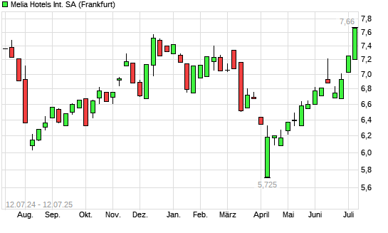 Mit dem Anstieg auf 7,66 EUR hat die Melia Hotels International-Aktie (ISIN ES0176252718) am 11.07.2025 ein neues 12-Monats-Hoch erreicht und damit den Kurs vom 12.12.2024 eingestellt.