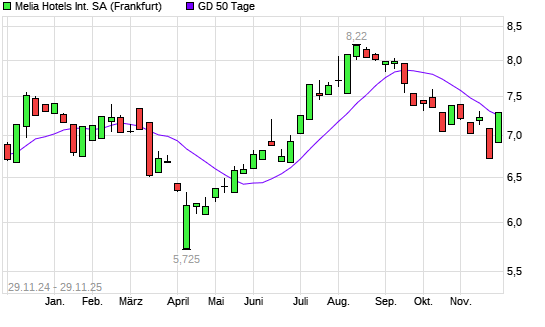 Mit dem Anstieg auf 7,29 EUR hat die Melia Hotels International-Aktie am 28.11.2025 die 50-Tage-Linie nach oben gekreuzt.Die Melia Hotels International-Aktie befindet sich seit dem 26.11.2025 ...weiterlesen