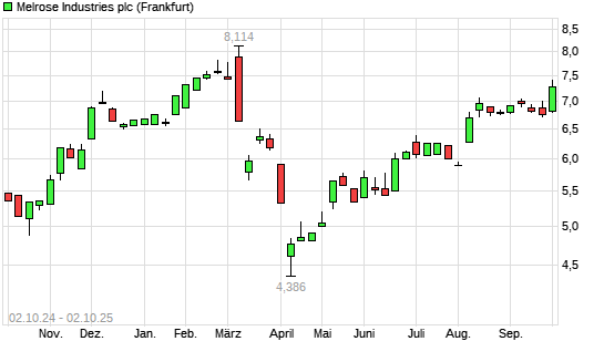 Mit dem Anstieg auf 7,13 EUR hat die Melrose Industries-Aktie (ISIN GB00BNGDN821) am 01.10.2025 ein neues 6-Monats-Hoch erreicht und damit den Kurs vom 13.08.2025 eingestellt.