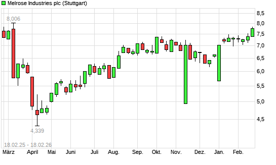 Mit dem Anstieg auf 7,50 EUR hat die Melrose Industries-Aktie (ISIN GB00BNGDN821) am 17.02.2026 ein neues 6-Monats-Hoch erreicht und damit den Kurs vom 03.10.2025 eingestellt.