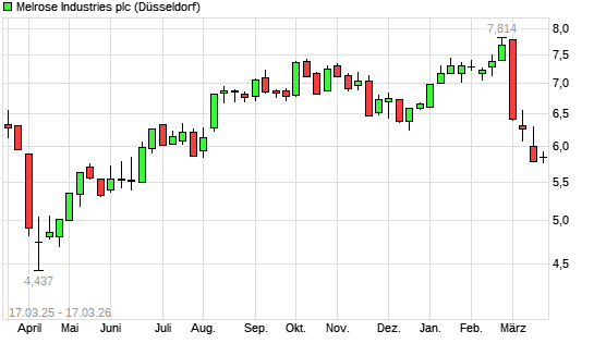 Mit dem Rücksetzer auf 5,86 EUR hat die Melrose Industries-Aktie (ISIN GB00BNGDN821) am 16.03.2026 ein neues 6-Monats-Tief erreicht und damit den Kurs vom 13.03.2026 eingestellt.