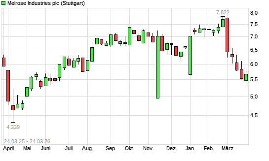 Mit dem Rücksetzer auf 5,43 EUR hat die Melrose Industries-Aktie (ISIN GB00BNGDN821) am 23.03.2026 ein neues 6-Monats-Tief erreicht und damit den Kurs vom 20.03.2026 eingestellt.