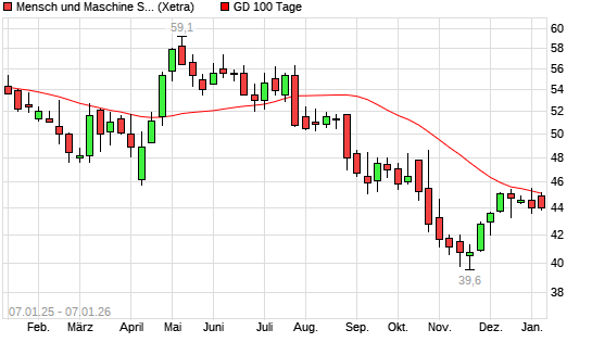 Mit dem Rücksetzer auf 44,50 EUR hat die Mensch und Maschine-Aktie am 06.01.2026 die 100-Tage-Linie nach unten gekreuzt.