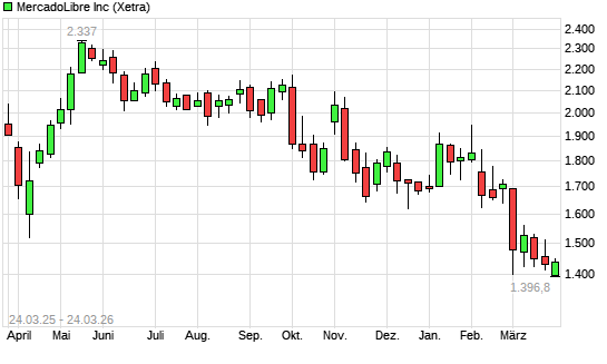Mit dem Rücksetzer auf 1.442,00 EUR hat die MercadoLibre-Aktie (ISIN US58733R1023) am 23.03.2026 ein neues 12-Monats-Tief erreicht und damit den Kurs vom 19.03.2026 eingestellt.