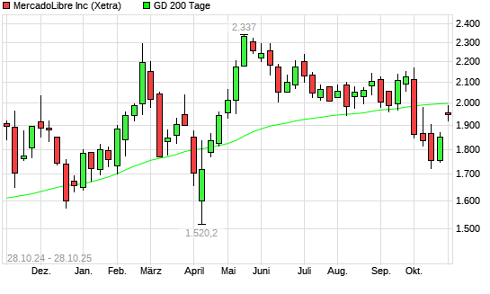 Mit dem Anstieg auf 2.011,00 EUR hat die MercadoLibre-Aktie am 27.10.2025 die 200-Tage-Linie nach oben gekreuzt.