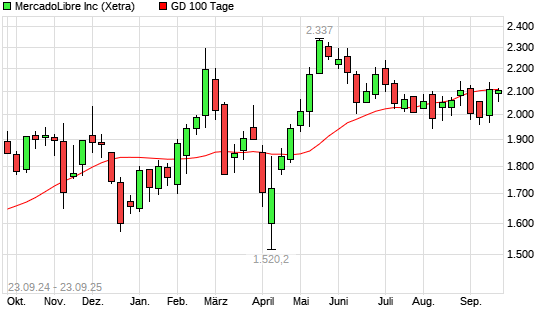 Mit dem Rücksetzer auf 2.056,00 EUR hat die MercadoLibre-Aktie am 22.09.2025 die 100-Tage-Linie nach unten gekreuzt.