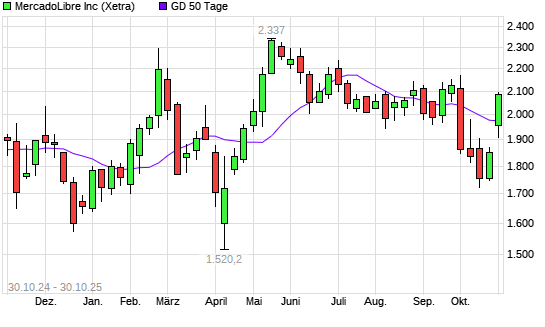Mit dem Rücksetzer auf 1.979,00 EUR hat die MercadoLibre-Aktie am 29.10.2025 die 50-Tage-Linie nach unten gekreuzt.