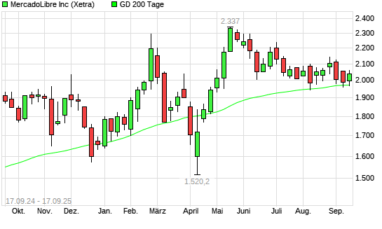 Mit dem Rücksetzer auf 1.956,40 EUR hat die MercadoLibre-Aktie am 16.09.2025 die 200-Tage-Linie nach unten gekreuzt.Die MercadoLibre-Aktie befand sich seit dem 23.04.2025 ...weiterlesen