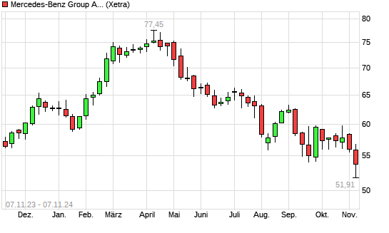 Mit dem Rücksetzer auf 52,70 EUR hat die Mercedes-Benz Group (ex Daimler)-Aktie (ISIN DE0007100000) am 06.11.2024 ein neues 12-Monats-Tief erreicht und damit den Kurs vom 20.09.2024 eingestellt.