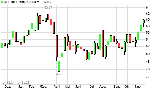 Mit dem Anstieg auf 59,64 EUR hat die Mercedes-Benz Group (ex Daimler)-Aktie (ISIN DE0007100000) am 13.11.2025 ein neues 6-Monats-Hoch erreicht und damit den Kurs vom 12.11.2025 eingestellt.