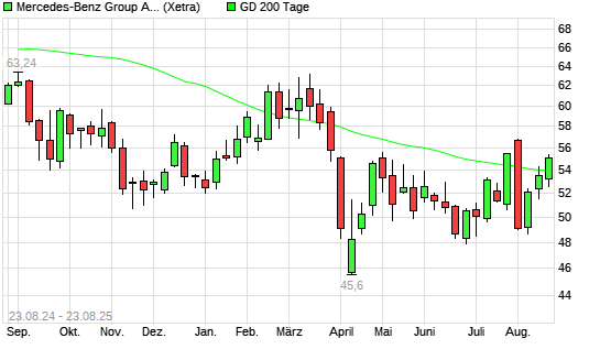 Mit dem Anstieg auf 54,95 EUR hat die Mercedes-Benz Group (ex Daimler)-Aktie am 22.08.2025 die 200-Tage-Linie nach oben gekreuzt.