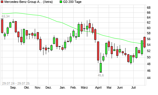 Mit dem Rücksetzer auf 53,51 EUR hat die Mercedes-Benz Group (ex Daimler)-Aktie am 28.07.2025 die 200-Tage-Linie nach unten gekreuzt.
