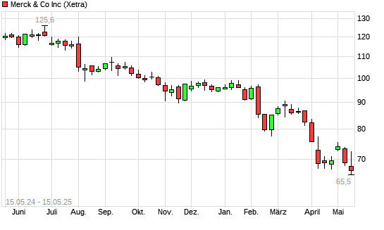 Mit dem Rücksetzer auf 66,10 EUR hat die Merck & Co-Aktie (ISIN US58933Y1055) am 14.05.2025 ein neues 3-Jahres-Tief erreicht und damit den Kurs vom 16.04.2025 eingestellt.