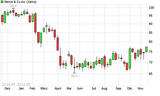 Mit dem Anstieg auf 78,30 EUR hat die Merck & Co-Aktie (ISIN US58933Y1055) am 11.11.2025 ein neues 6-Monats-Hoch erreicht und damit den Kurs vom 01.10.2025 eingestellt.