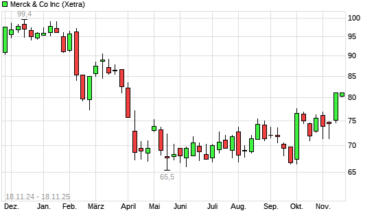 Mit dem Anstieg auf 80,70 EUR hat die Merck & Co-Aktie (ISIN US58933Y1055) am 17.11.2025 ein neues 6-Monats-Hoch erreicht und damit den Kurs vom 13.11.2025 eingestellt.