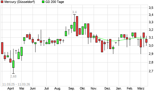 Mit dem Rücksetzer auf 3,06 EUR hat die Mercury-Aktie am 10.03.2026 die 200-Tage-Linie nach unten gekreuzt.