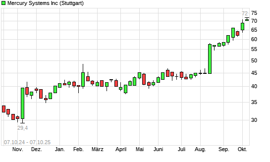 Mit dem Anstieg auf 70,50 EUR hat die Mercury Systems-Aktie (ISIN US5893781089) am 06.10.2025 ein neues 3-Jahres-Hoch erreicht und damit den Kurs vom 03.10.2025 eingestellt.