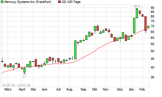 Mit dem Anstieg auf 68,50 EUR hat die Mercury Systems-Aktie am 09.02.2026 die 100-Tage-Linie nach oben gekreuzt.
