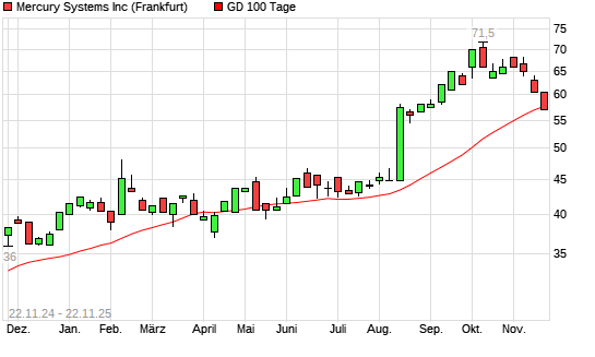 Mit dem Rücksetzer auf 57,00 EUR hat die Mercury Systems-Aktie am 21.11.2025 die 100-Tage-Linie nach unten gekreuzt.