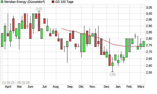 Mit dem Anstieg auf 2,78 EUR hat die Meridian Energy-Aktie am 04.03.2026 die 100-Tage-Linie nach oben gekreuzt.