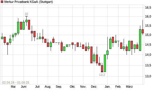 Mit dem Anstieg auf 15,30 EUR hat die Merkur Bank-Aktie (ISIN DE0008148206) am 31.03.2025 ein neues 6-Monats-Hoch erreicht und damit den Kurs vom 30.12.2024 eingestellt.