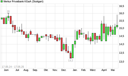 Mit dem Anstieg auf 15,50 EUR hat die Merkur Bank-Aktie (ISIN DE0008148206) am 16.05.2025 ein neues 6-Monats-Hoch erreicht und damit den Kurs vom 15.05.2025 eingestellt.