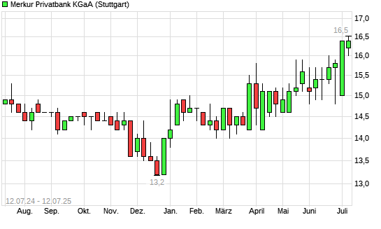 Mit dem Anstieg auf 16,60 EUR hat die Merkur Bank-Aktie (ISIN DE0008148206) am 11.07.2025 ein neues All-Time-High erreicht und damit den Kurs vom 01.01.2024 eingestellt.