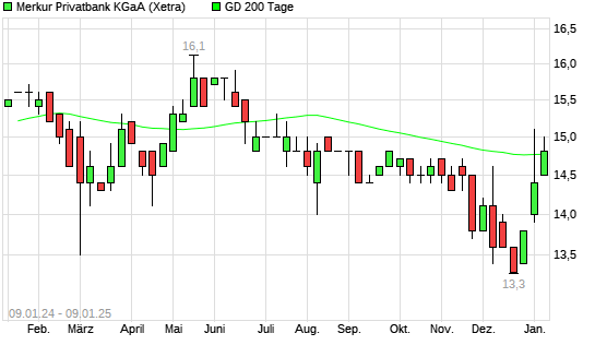 Mit dem Anstieg auf 14,70 EUR hat die Merkur Bank-Aktie am 08.01.2025 die 200-Tage-Linie nach oben gekreuzt.