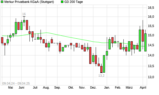 Mit dem Anstieg auf 14,60 EUR hat die Merkur Bank-Aktie am 08.04.2025 die 200-Tage-Linie nach oben gekreuzt.