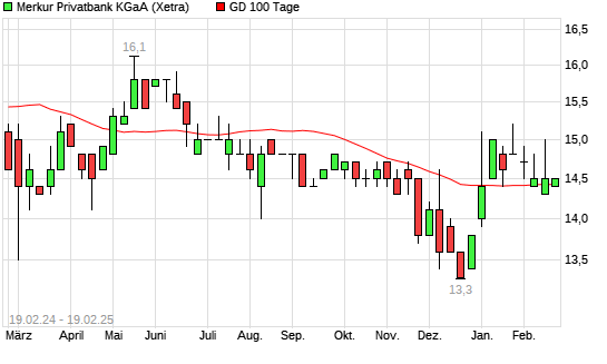Mit dem Rücksetzer auf 14,20 EUR hat die Merkur Bank-Aktie am 18.02.2025 die 100-Tage-Linie nach unten gekreuzt.