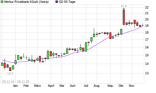 Mit dem Rücksetzer auf 18,70 EUR hat die Merkur Bank-Aktie am 27.11.2025 die 50-Tage-Linie nach unten gekreuzt.