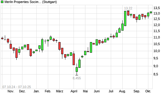 Mit dem Anstieg auf 13,27 EUR hat die Merlin Properties Socimi-Aktie (ISIN ES0105025003) am 06.10.2025 ein neues 5-Jahres-Hoch erreicht und damit den Kurs vom 02.10.2025 eingestellt.