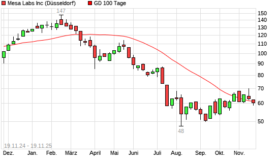 Mit dem Rücksetzer auf 60,50 EUR hat die Mesa Laboratories-Aktie am 18.11.2025 die 100-Tage-Linie nach unten gekreuzt.