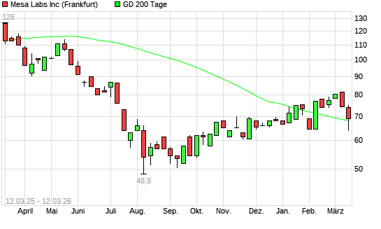 Mit dem Rücksetzer auf 64,00 EUR hat die Mesa Laboratories-Aktie am 11.03.2026 die 200-Tage-Linie nach unten gekreuzt.