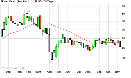 Mit dem Rücksetzer auf 66,01 EUR hat die MetLife-Aktie am 06.11.2025 die 100-Tage-Linie nach unten gekreuzt.