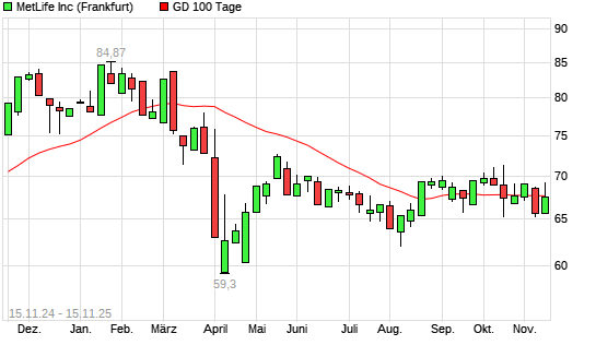 Mit dem Rücksetzer auf 67,57 EUR hat die MetLife-Aktie am 14.11.2025 die 100-Tage-Linie nach unten gekreuzt.