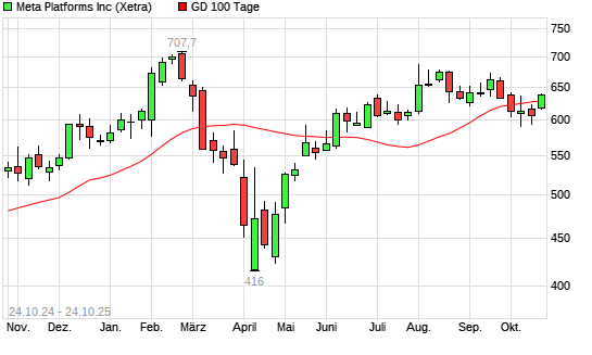 Mit dem Anstieg auf 632,00 EUR hat die Meta Platforms (ex Facebook)-Aktie am 23.10.2025 die 100-Tage-Linie nach oben gekreuzt.