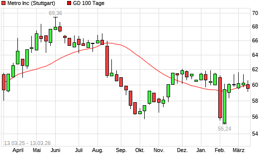 Mit dem Rücksetzer auf 59,48 EUR hat die Metro-Aktie am 12.03.2026 die 100-Tage-Linie nach unten gekreuzt.