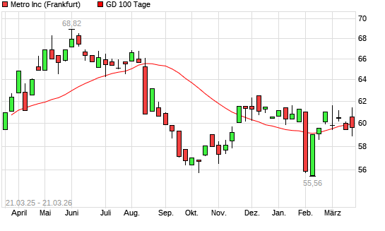 Mit dem Rücksetzer auf 59,62 EUR hat die Metro-Aktie am 20.03.2026 die 100-Tage-Linie nach unten gekreuzt.