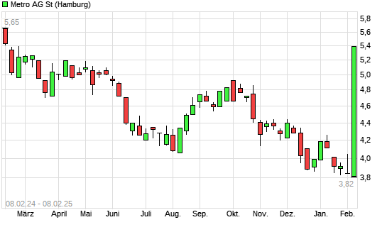 Mit dem Anstieg auf 5,39 EUR hat die Metro St-Aktie (ISIN DE000BFB0019) am 07.02.2025 ein neues 6-Monats-Hoch erreicht und damit den Kurs vom 06.02.2025 eingestellt.