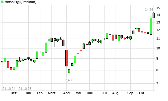 Mit dem Anstieg auf 14,32 EUR hat die Metso Outotec-Aktie (ISIN FI0009014575) am 30.10.2025 ein neues All-Time-High erreicht und damit den Kurs vom 28.10.2025 eingestellt.