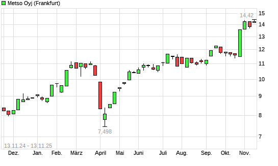 Mit dem Anstieg auf 14,42 EUR hat die Metso Outotec-Aktie (ISIN FI0009014575) am 12.11.2025 ein neues All-Time-High erreicht und damit den Kurs vom 30.10.2025 eingestellt.